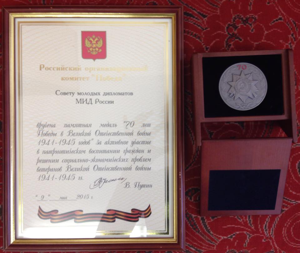 Сегодня Министр иностранных дел России С.В.Лавров вручил Председателю Совета молодых дипломатов МИД России К.О.Колпакову памятную медаль.