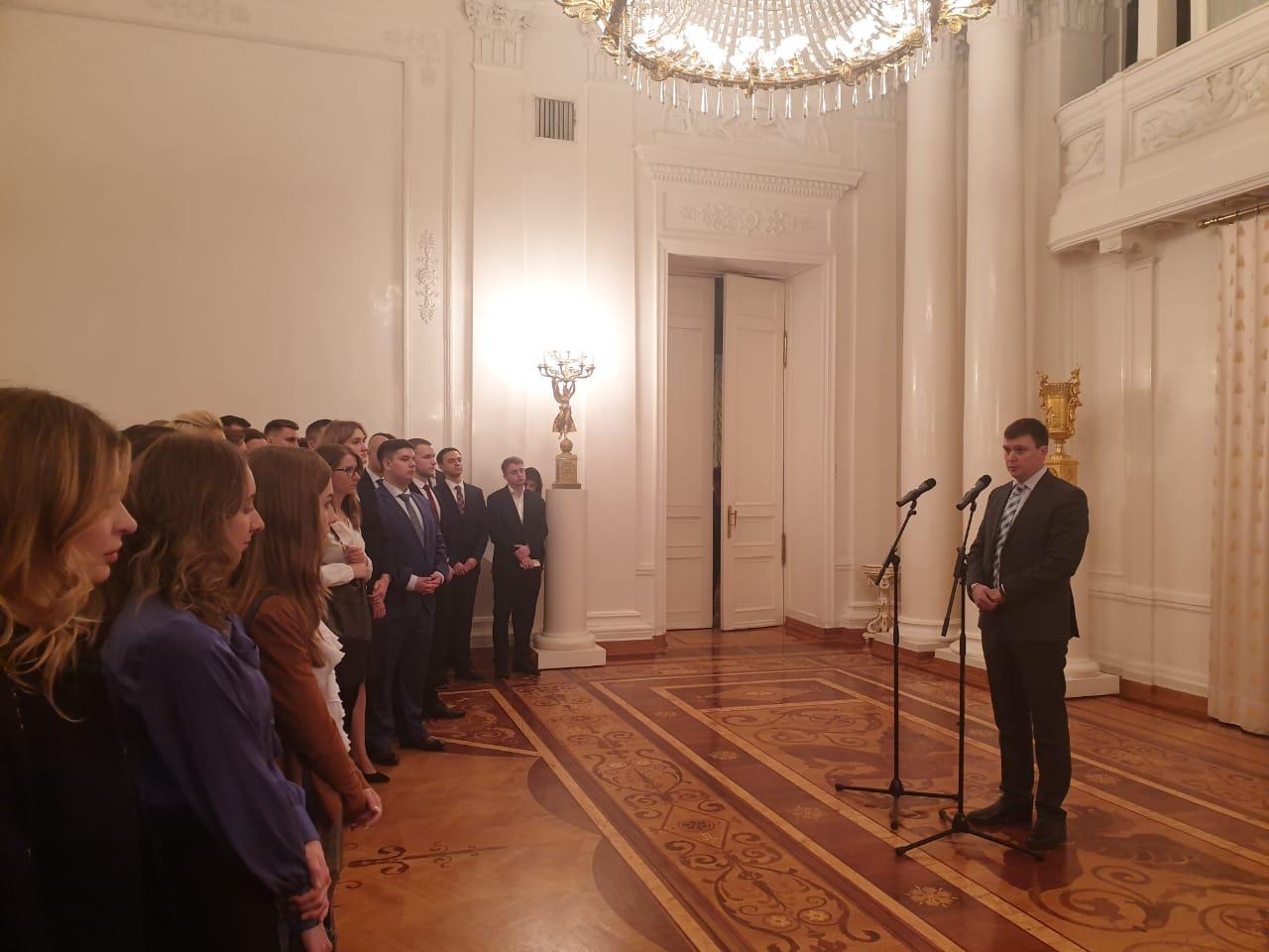 Выпускников приветствовал председатель СМД К.Колпаков, который рассказал о деятельности СМД и его сотрудничестве с ассоциациями молодых дипломатов стран-партнеров.